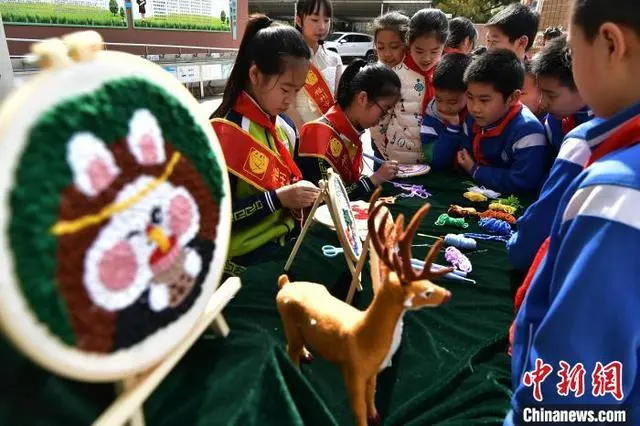 3月15日,以“独具匠心多彩‘遗’迹”为主题的非遗文化进校园活动在福州市仓山区第六中心小学举行,来自多所学校的学生现场展示了扎染、版画、漆画、陶艺等非物质文化遗产。图为学生们在活动上参观了解毛线刺绣制作技艺。(图片来源:中新网)