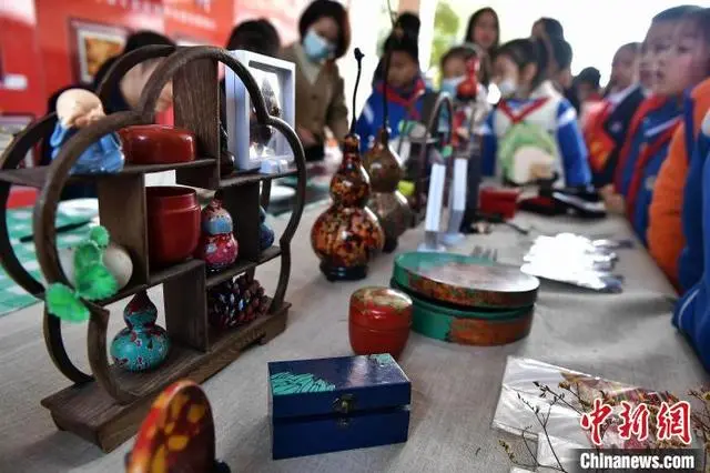 3月15日,以“独具匠心多彩‘遗’迹”为主题的非遗文化进校园活动在福州市仓山区第六中心小学举行,来自多所学校的学生现场展示了扎染、版画、漆画、陶艺等非物质文化遗产。图为学生们在活动上参观了解传统工艺制作的漆器作品。(图片来源:中新网)