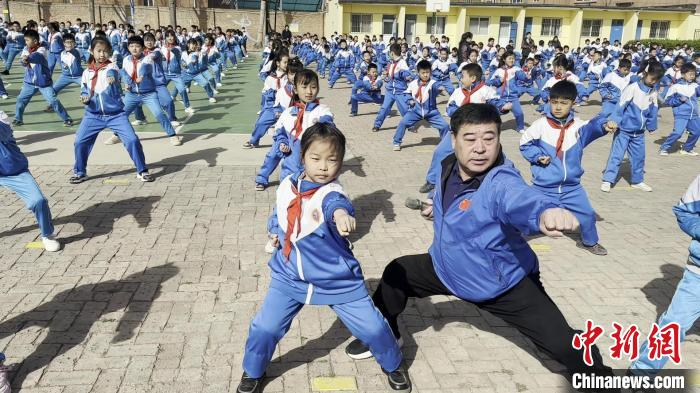 3月15日,国家级非物质文化遗产“戳脚”传承基地落户衡水高新区北环路小学暨戳脚武术进校园启动仪式,在河北衡水高新区北环路小学举行。国家级非物质文化遗产戳脚传承人宋君杰现场指导学生练习戳脚,学生们学起来格外认真。图为宋君杰指导学生练习戳脚。(图片来源:中新网)