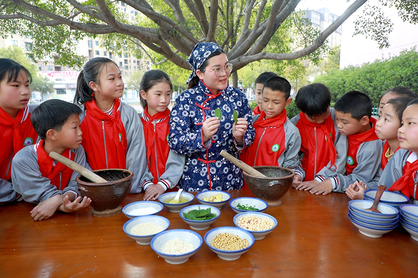 江西省赣州市全南县依托教育“双减”政策,把人类非遗——赣南客家擂茶制作技艺等传统文化引入课堂,在锻炼学生动手能力的同时,让学生们近距离感受和传承“非遗”文化。图为在江西省赣州市全南县第四小学“双减”课堂上,老师正在教学生们制作擂茶。(图片来源:人民网)