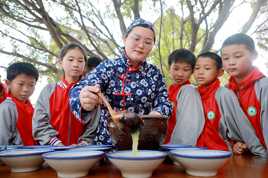 在江西省赣州市全南县第四小学“双减”课堂上,老师正在教学生们制作擂茶。(图片来源:人民网)