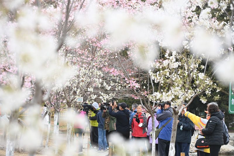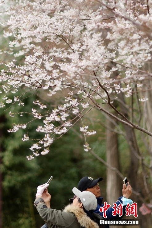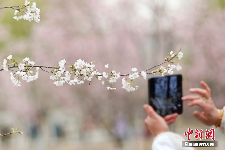 3月17日,北京玉渊潭公园内,市民观赏绽放的杭州早樱。(图片来源:中新网)