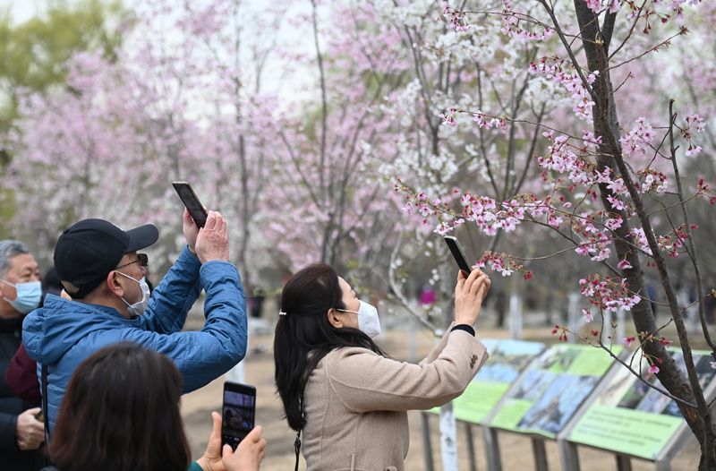 3月17日,游客在玉渊潭公园樱花园赏樱、拍照。(图片来源:新华社)