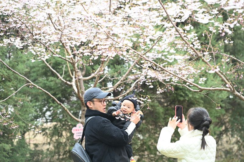 3月17日,一家三口在樱花树下赏樱、拍照。(图片来源:新华社)