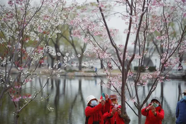 3月17日,北京玉渊潭公园内,市民观赏绽放的杭州早樱。(图片来源:中新社)![]()