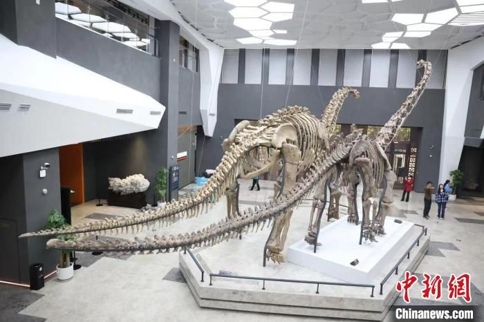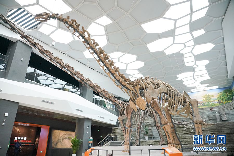 重庆自然资源科普馆内的“镇馆之宝”马门溪龙、黄河巨龙装架。(图片来源:中新网)