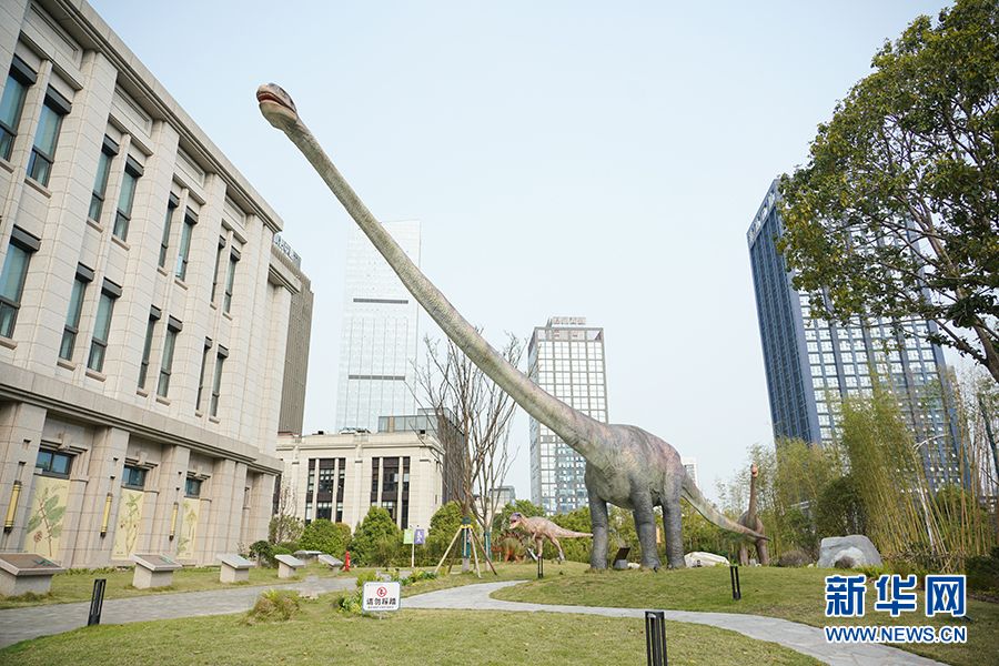 重庆自然资源科普馆室外主题展区陈设的恐龙模型。(图片来源:新华网)
