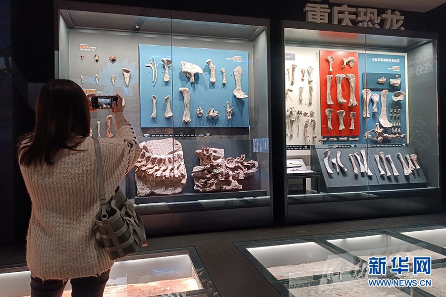 一位游客在展厅内的重庆恐龙化石标本前拍照。(图片来源:新华网)