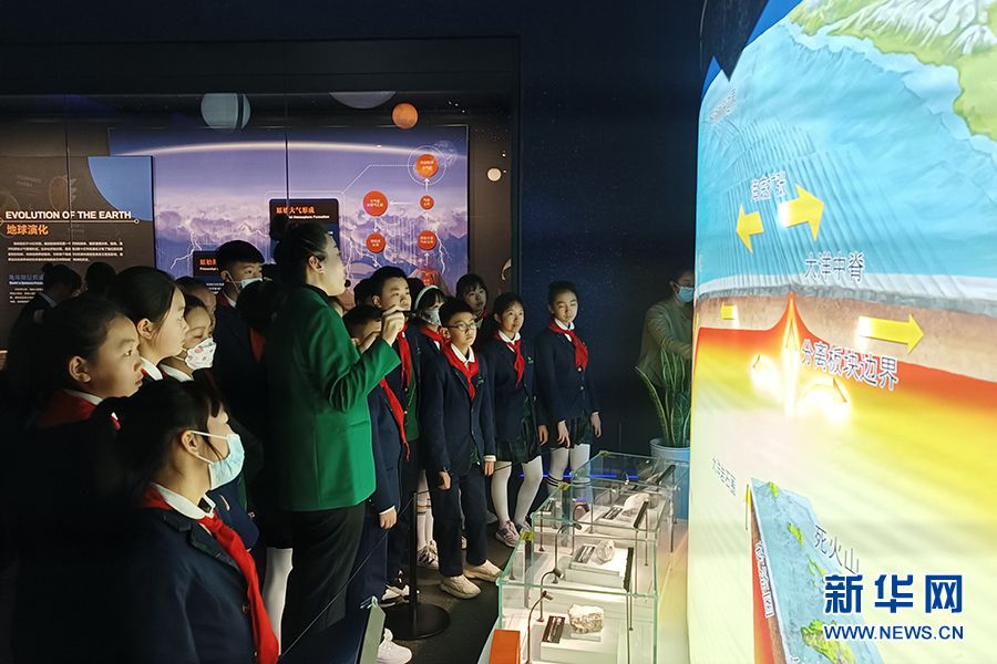 重庆自然资源科普馆地质演化展厅内,讲解员正在给学生们科普地质知识。(图片来源:新华网)