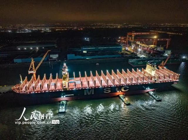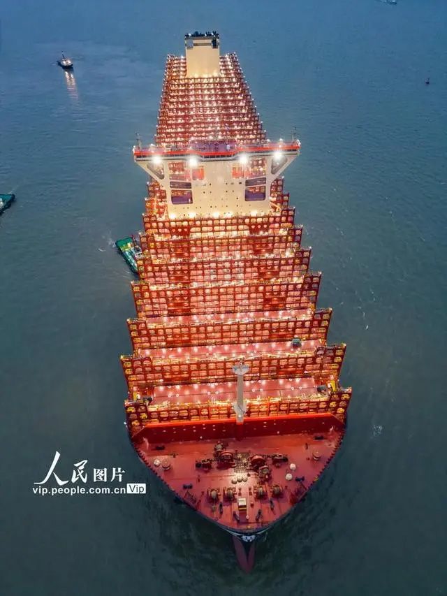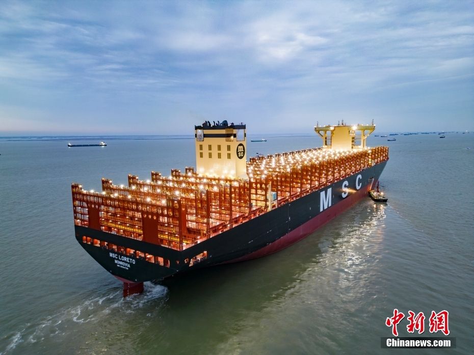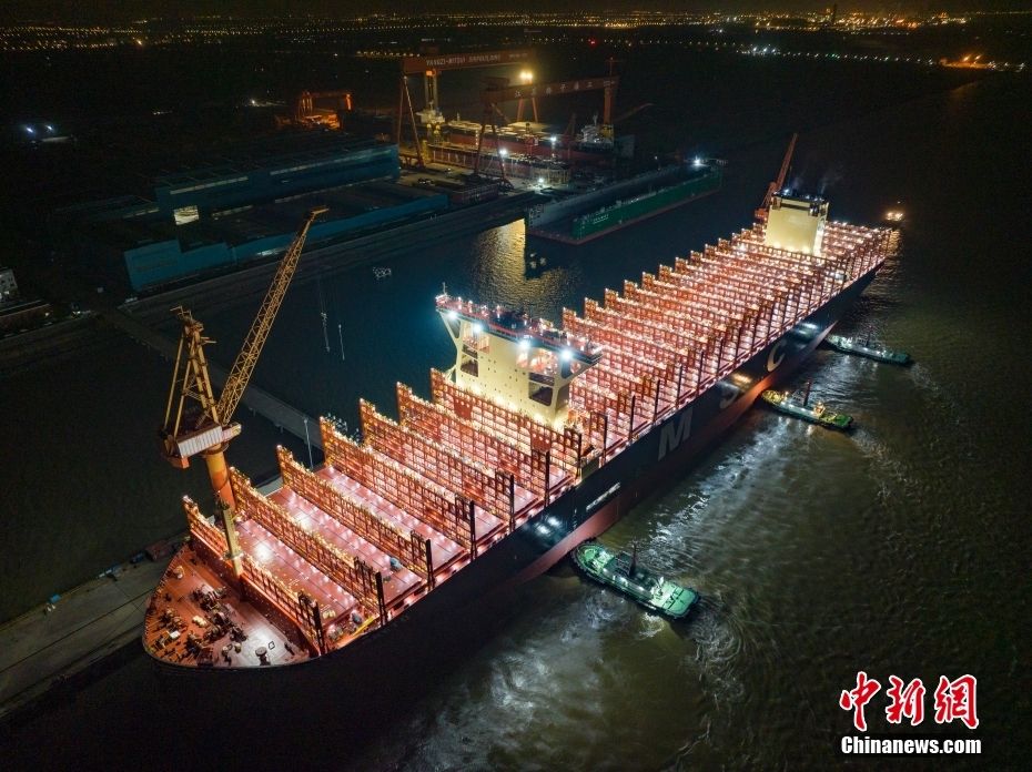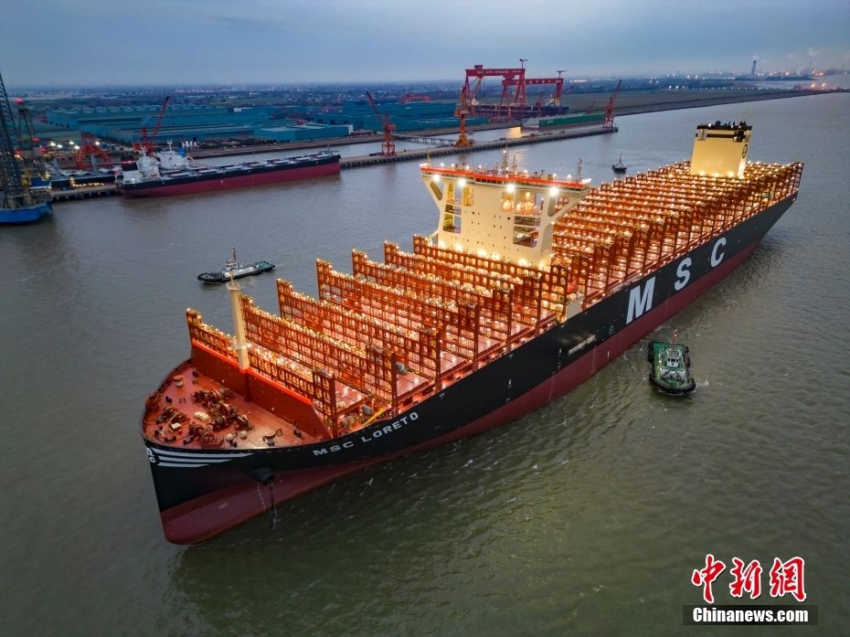 全球最大新造集装箱船“鑫福103”轮正在离泊。(图片来源:中新网)
