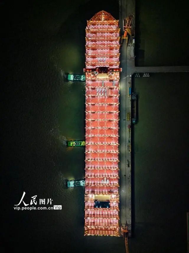 19日凌晨5时许,全球最大新造集装箱船“鑫福103”轮在多艘拖带轮的协助作业下,缓缓驶离太仓港经济技术开发区扬子三井造船有限公司码头,驶往浙江海域开启试航。(图片来源:《浙江日报》)