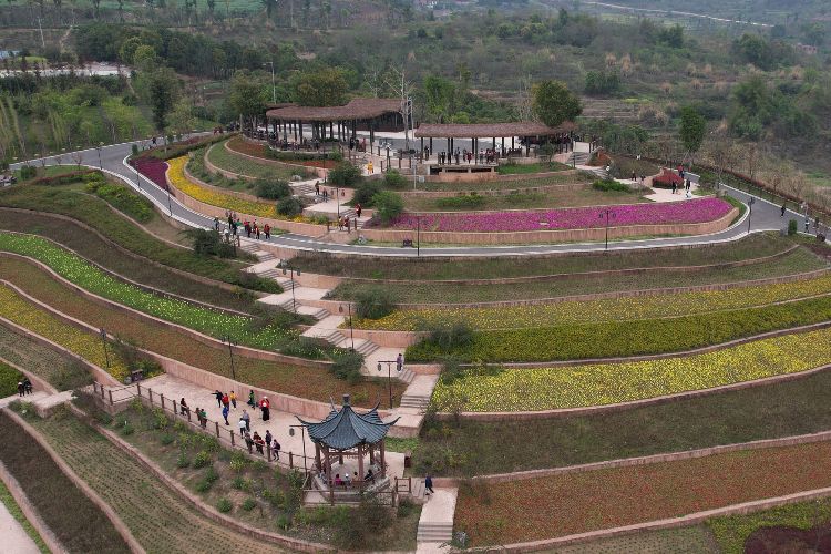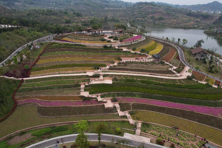 3月21日,航拍重庆璧山古道湾公园内的梯田花海。(图片来源:中新社)