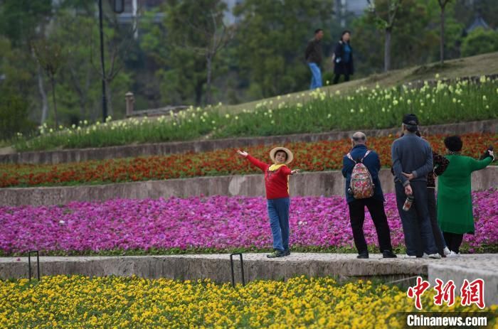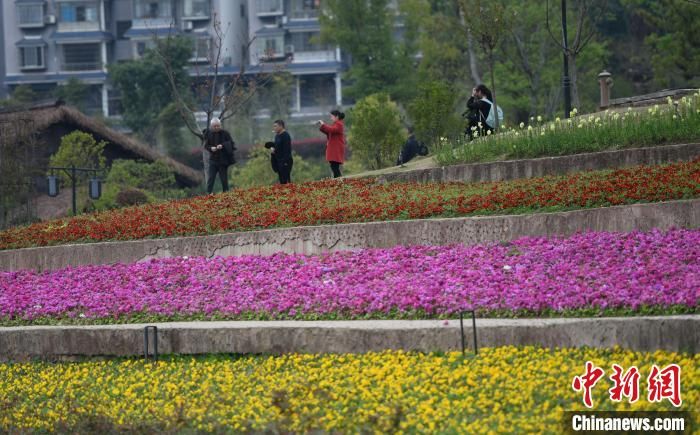 3月21日,重庆璧山古道湾公园内的梯田花海吸引市民拍照打卡。(图片来源:中新社)