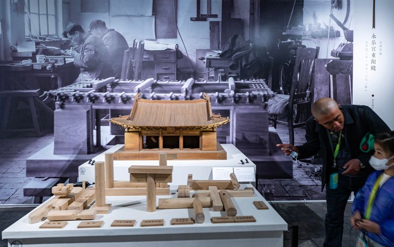 祖孙二人在“山西芮城元代永乐宫重阳殿”模型及中国传统卯榫结构体验区前参观。(图片来源:中新社)