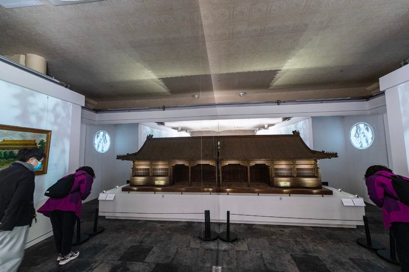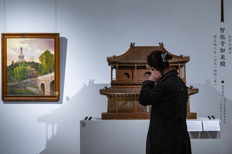 观众参观“北京东城区明代智化寺如来殿”模型。(图片来源:中新社)