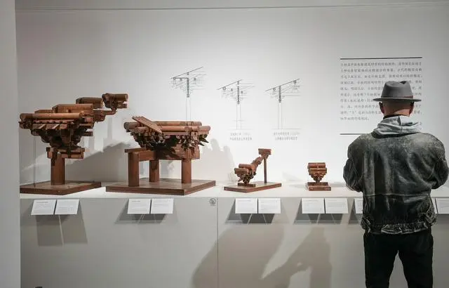 “结构之趣”展区,梁架和斗栱成了主角。佛光寺大殿梁架模型、故宫转角斗栱模型、善化寺大雄宝殿转角斗拱模型等,呈现出中国建筑结构的无限妙趣。(图片来源:《北京日报》客户端)