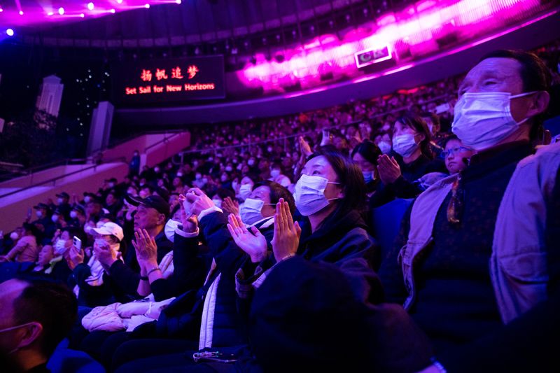 观众在第十四届武汉国际杂技艺术节开幕式上观看《英雄之城》。(图片来源:新华社)