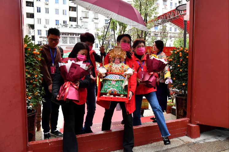 福建福州,两岸信众代表护送台湾桃园中坜凤仪宫供奉的陈靖姑金身塑像回到故居“省亲”。(图片来源:中新社)