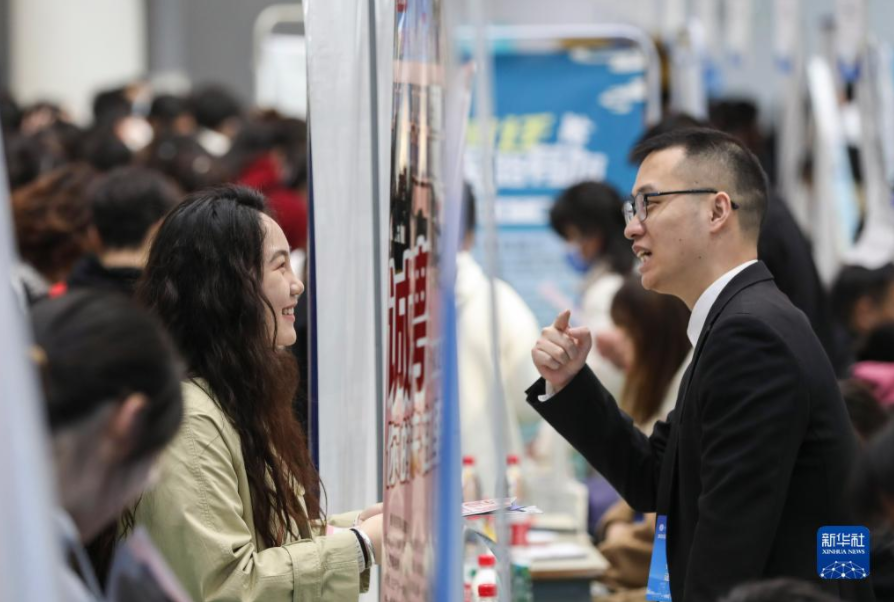 3月26日,在位于江苏淮安的江苏护理职业学院,大学生在2023年春季校园招聘会上与用人单位工作人员交流。(图片来源:新华网)