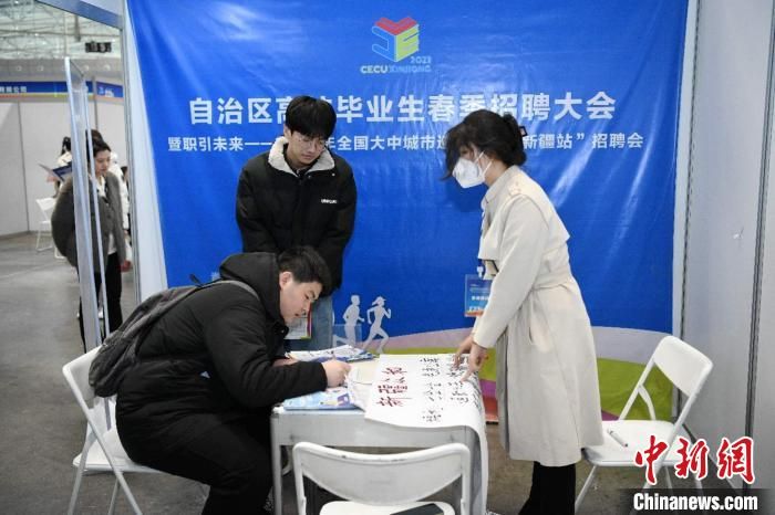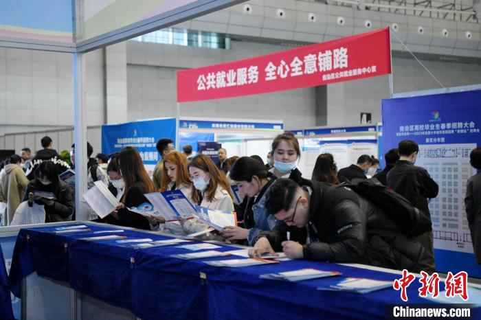 3月25—26日,新疆高校毕业生春季招聘大会暨2023年全国大中城市巡回招聘“新疆站”招聘会在新疆国际会展中心启动。图为招聘会现场求职者在咨询台咨询。(图片来源:中新网)