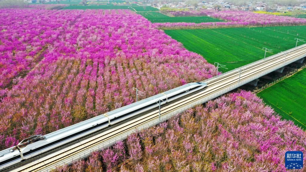3月27日,高铁列车从许昌市建安区小召乡紫荆花海中驶过。河南省许昌市建安区小召乡约200亩紫荆进入盛花期,吸引众多游客前来踏青赏花。(图片来源:新华网)