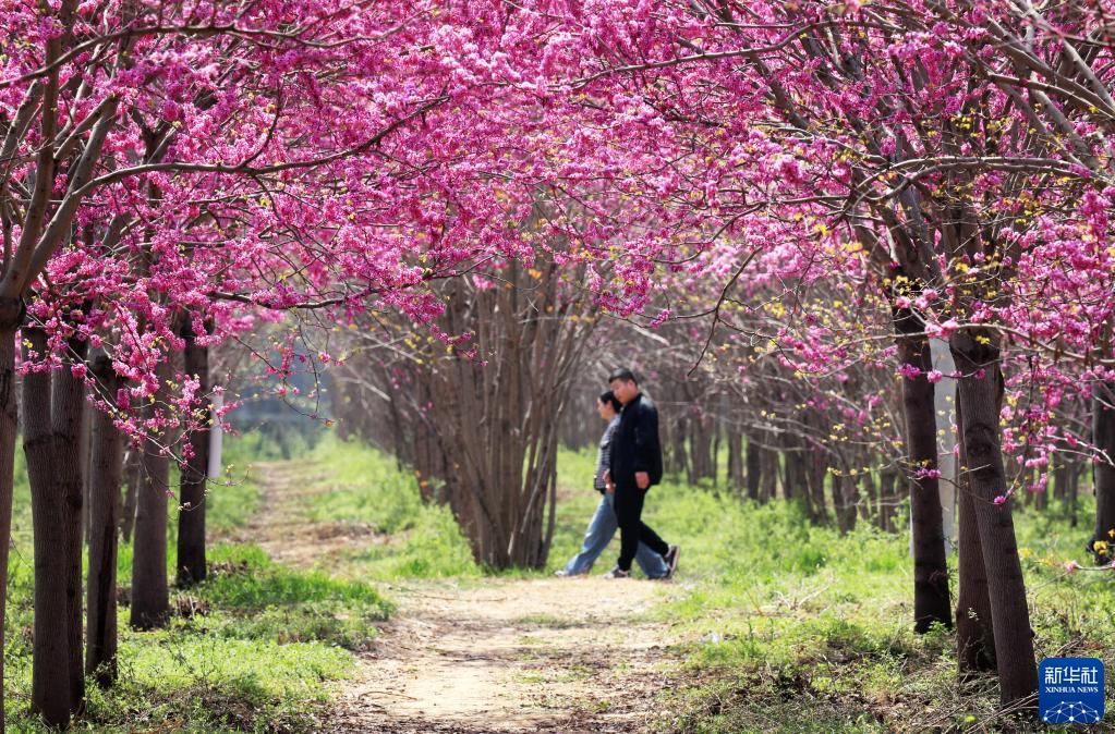 3月27日,游人在许昌市建安区小召乡的紫荆花海中游玩。(图片来源:新华网)