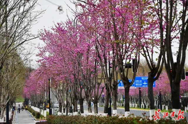 3月27日,武汉市青山区建设十路两边,270余株高大的树木被湖北紫荆串染成了紫红色,一个个枝条上爬满了紫蝴蝶形状的花朵,远看如红云漫卷。(图片来源:《长江日报》)