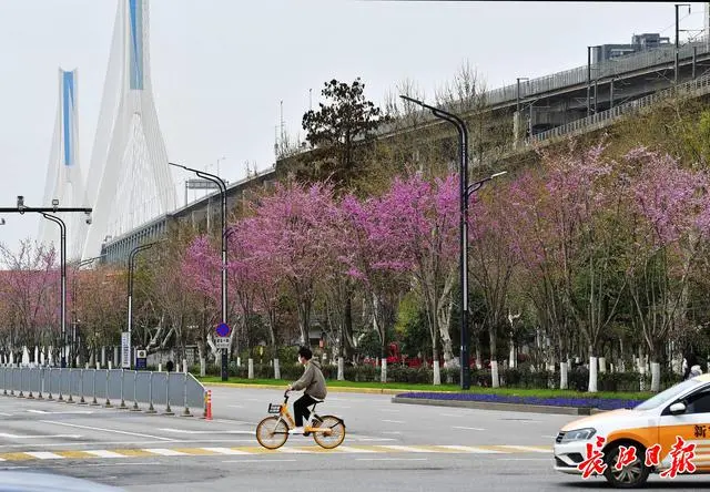 3月27日,市民在宁波市鄞州区甬港北路骑行。近日,浙江省宁波市鄞州区甬港北路两侧的紫荆花开放。(图片来源:新华网)