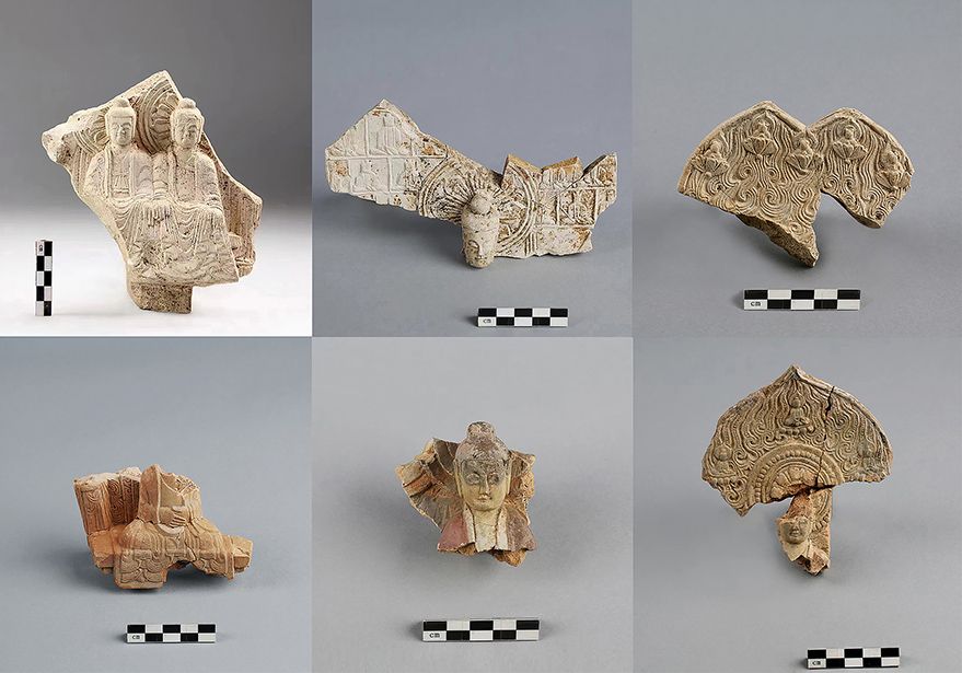 吉林珲春古城村1号寺庙址出土的佛像残片(拼版资料照片)。