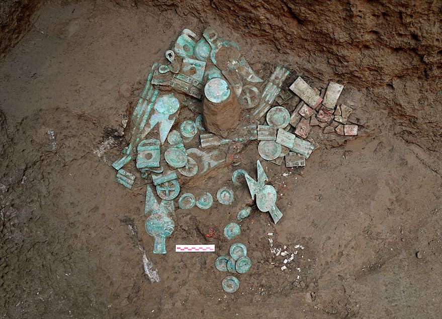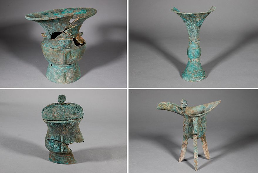 河南安阳殷墟商王陵祭祀坑K23出土的青铜器(拼版资料照片)。