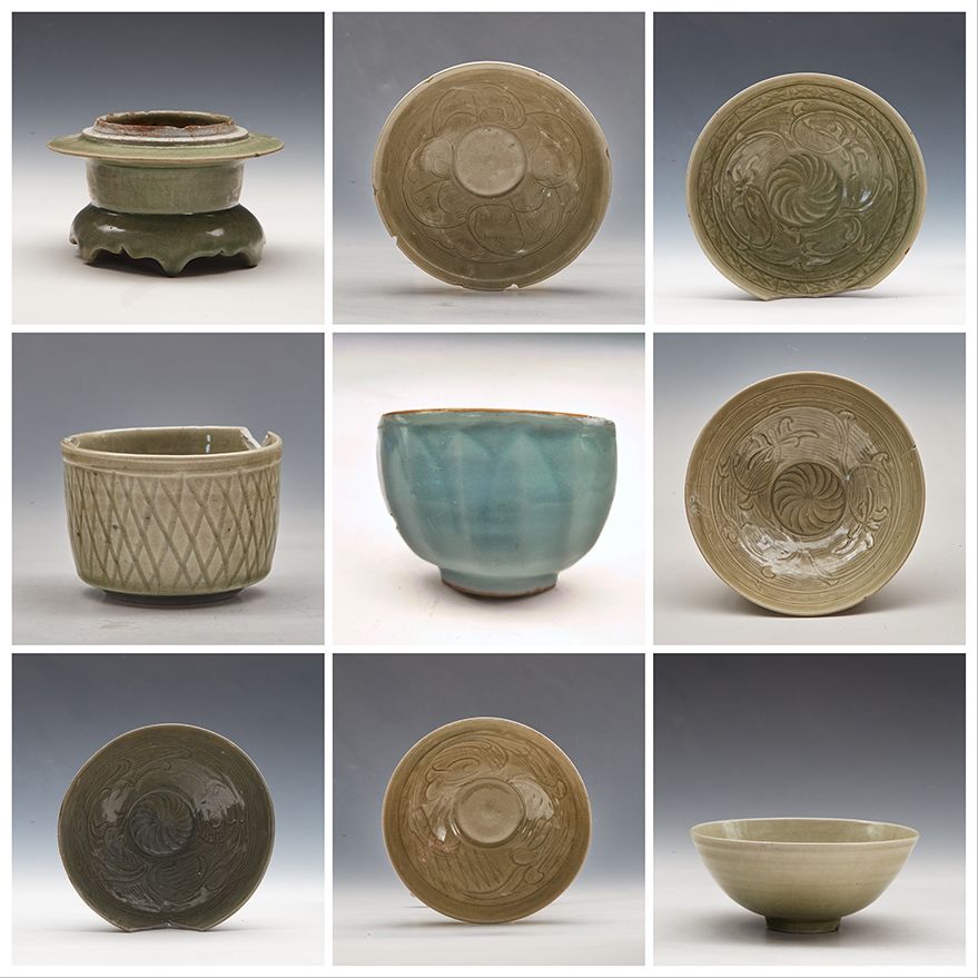 浙江温州朔门古港遗址发掘出的龙泉窑瓷器(拼版资料照片)。