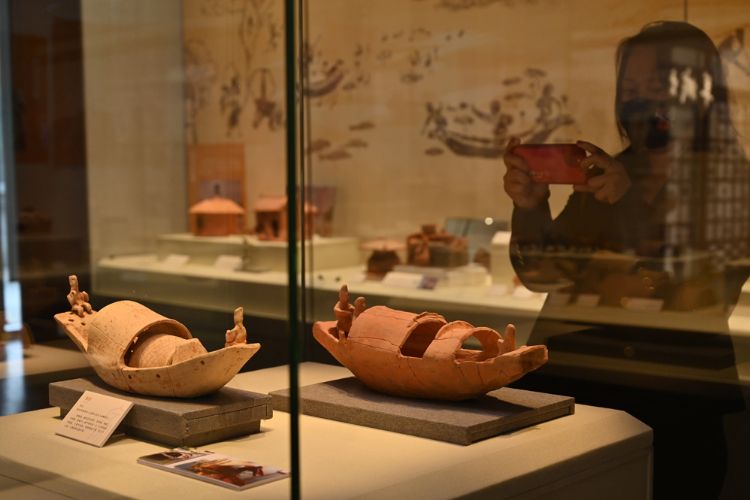 展览展出的东汉陶船吸引参观者。(图片来源:中新社)