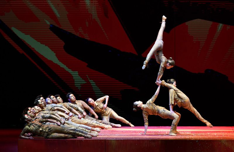 3月28日,在位于山东省济南市的山东省会大剧院,演员表演杂技节目《丰碑》。(图片来源:新华社)
