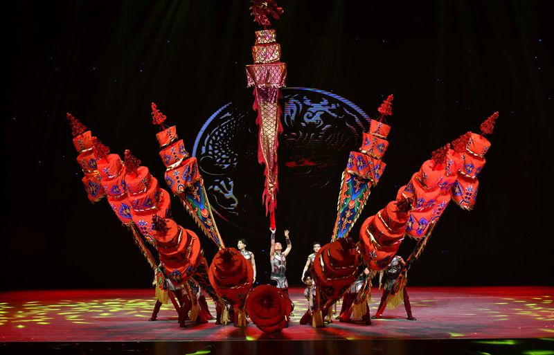 3月28日,在位于山东省济南市的山东省会大剧院,演员表演杂技节目《龙跃神州·中幡》。(图片来源:新华社)