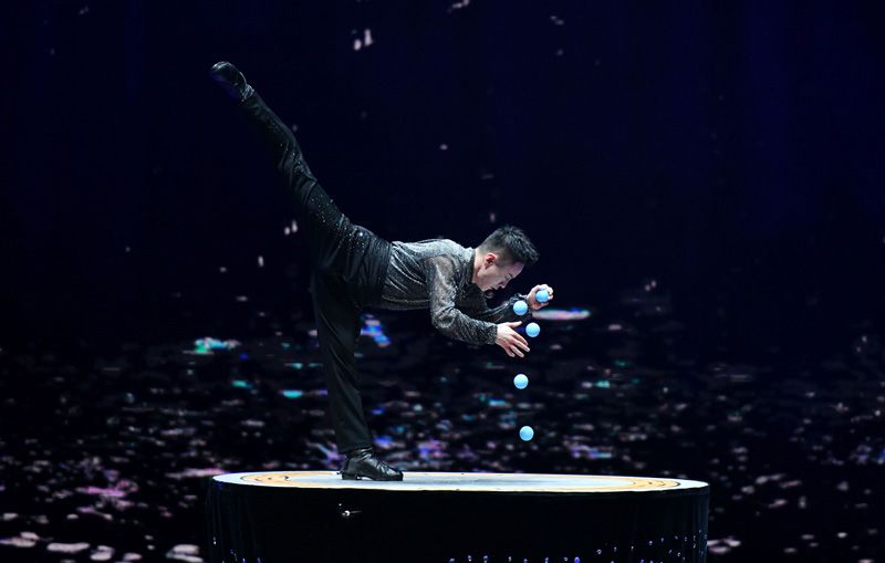 3月28日,在位于山东省济南市的山东省会大剧院,演员表演杂技节目《雨中狂想·球技》。(图片来源:新华社)