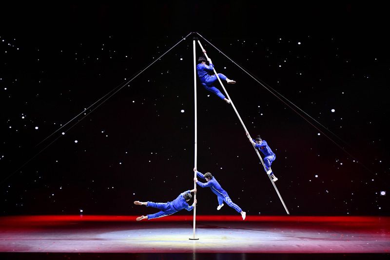 3月28日,在位于山东省济南市的山东省会大剧院,演员表演杂技节目《逐梦空天·男女集体爬杆》。(图片来源:新华社)