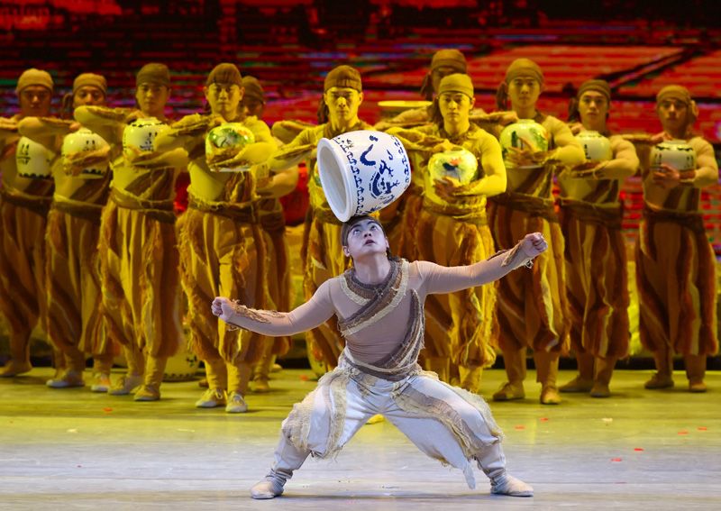 3月28日,在位于山东省济南市的山东省会大剧院,演员表演杂技节目《坛韵》。(图片来源:新华社)