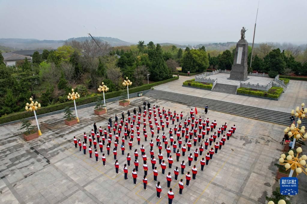 3月30日,学生在安徽省滁州市来安县半塔镇的皖东烈士陵园祭奠先烈(无人机照片)。(图片来源:新华网)