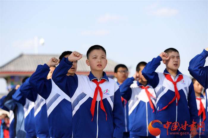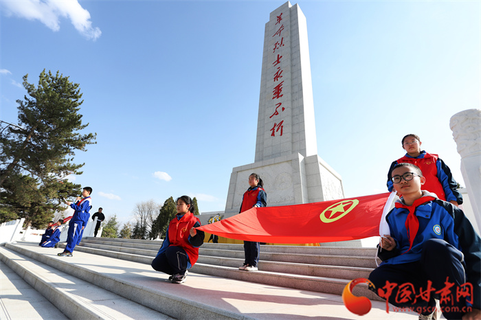 3月29日下午,在平凉市烈士陵园革命烈士纪念碑前,来自平凉市第四中学的240余名共青团员和少先队员庄严肃立,举起右拳宣誓,表达对革命先烈的无限敬仰和深切哀思。(图片来源:中国甘肃网)