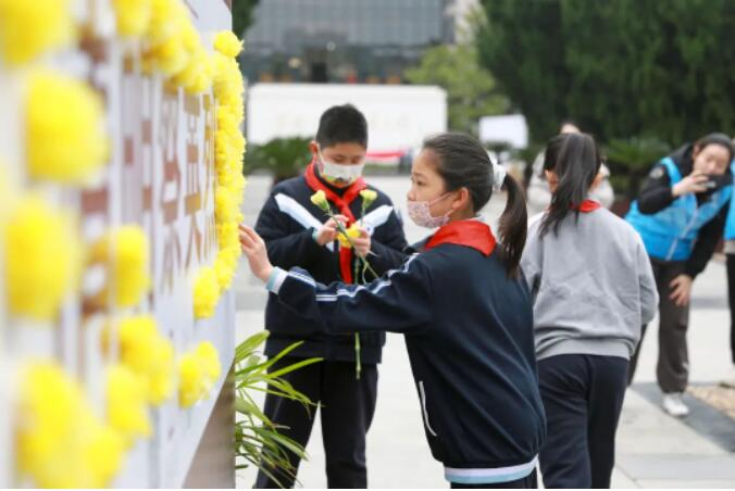 近日,闵行区第二实验小学以党带团、团带队的方式走出校园,来到红色场馆——闵行区烈士陵园,祭奠英雄,缅怀历史,厚植爱国情怀,拉开了“思政第一课堂”的序幕。图为学生为英烈献花。(图片来源:人民网)