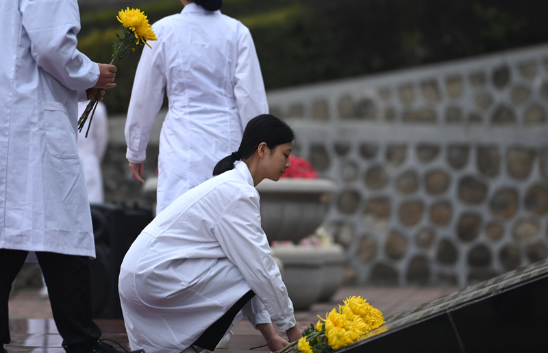 3月24日,再河南郑州市红十字会举办的“生命·遇见”2023清明节遗体、器官(角膜)捐献缅怀纪念活动上,医学生为遗体、器官(角膜)捐献者献上白菊。(图片来源:中新网)