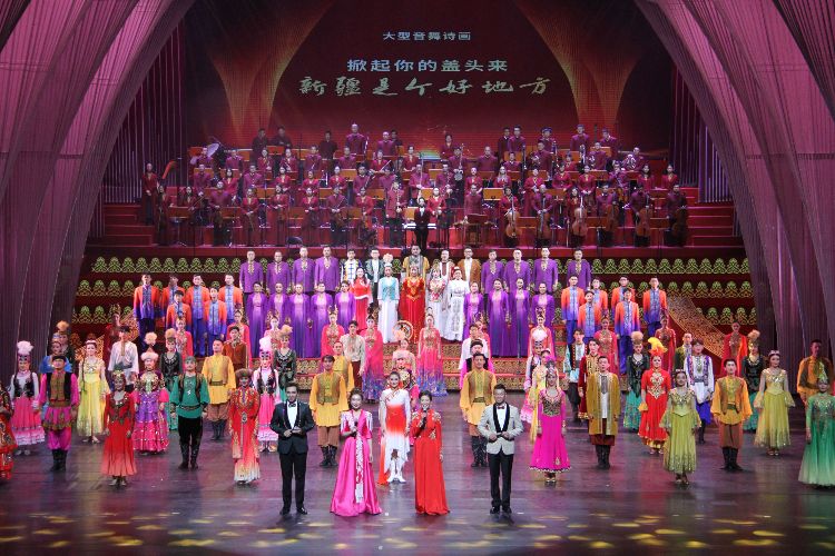 4月1日,大型音舞诗画《掀起你的盖头来——新疆是个好地方》在乌鲁木齐文化中心大剧院上演。(图片来源:新华社)