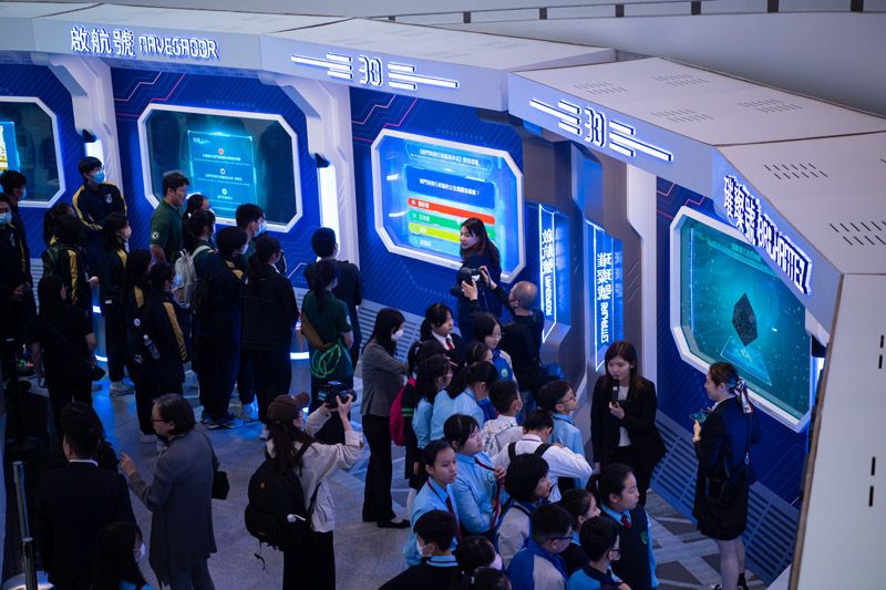 澳门学生在《中华人民共和国澳门特别行政区基本法》颁布三十周年纪念展上参观。(图片来源:香港中通社)![]()