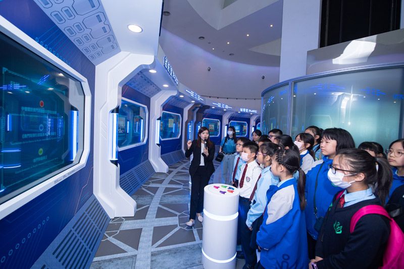 澳门基本法颁布30周年展览现场,导赏员(左)为观展学生讲解多媒体互动方法。(图片来源:人民网)