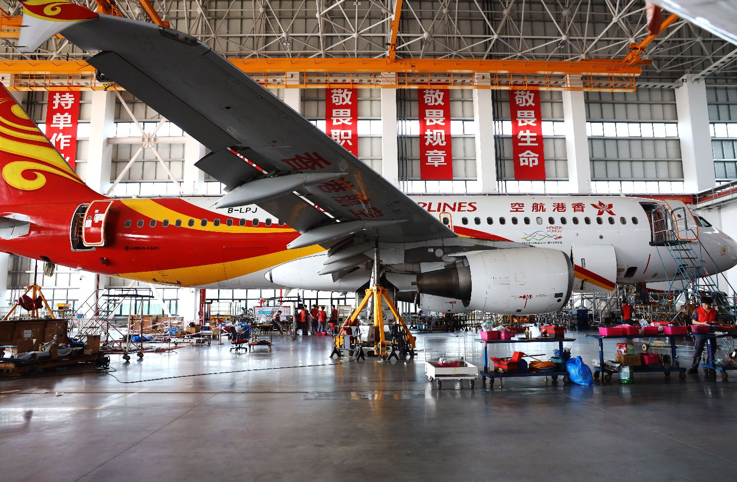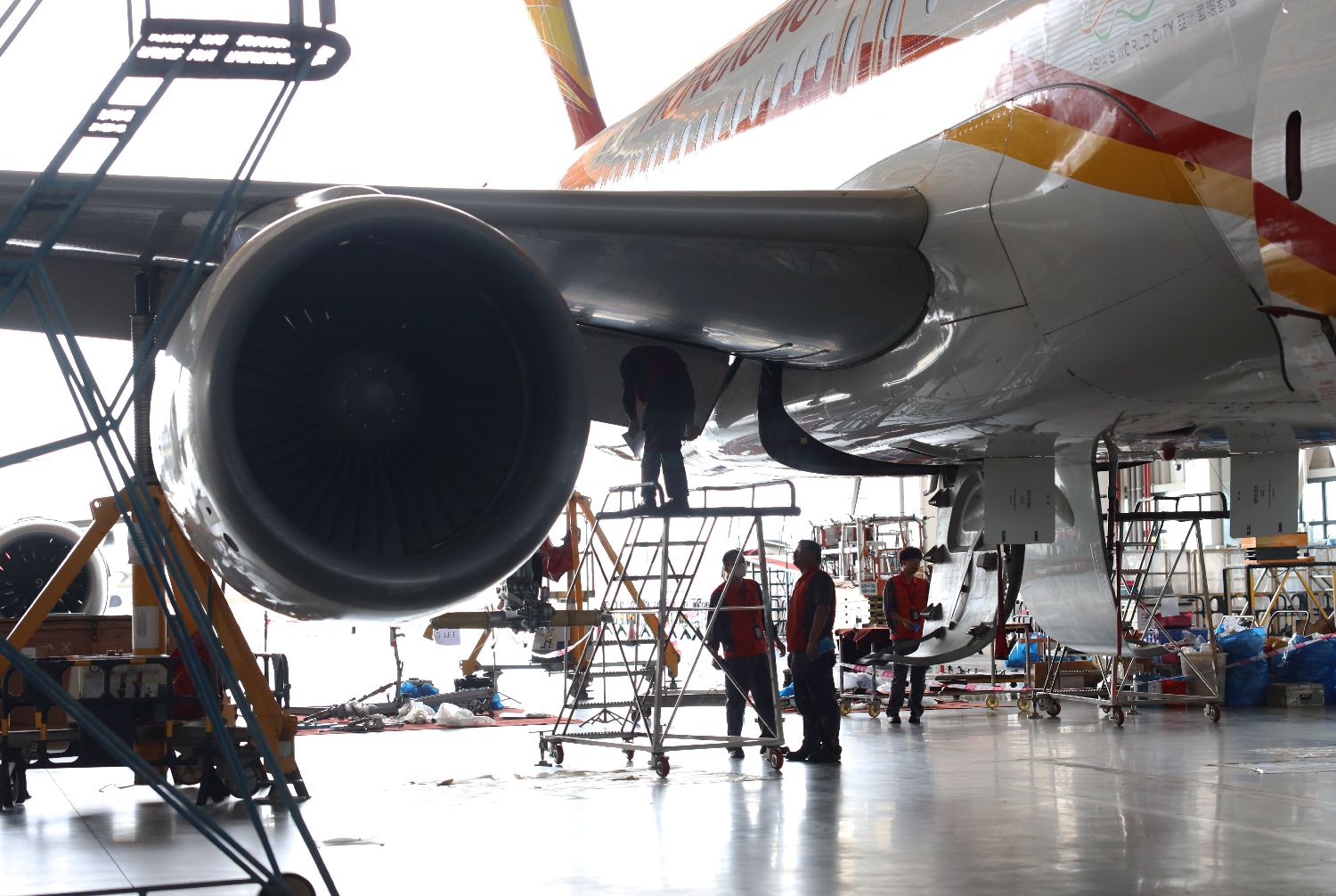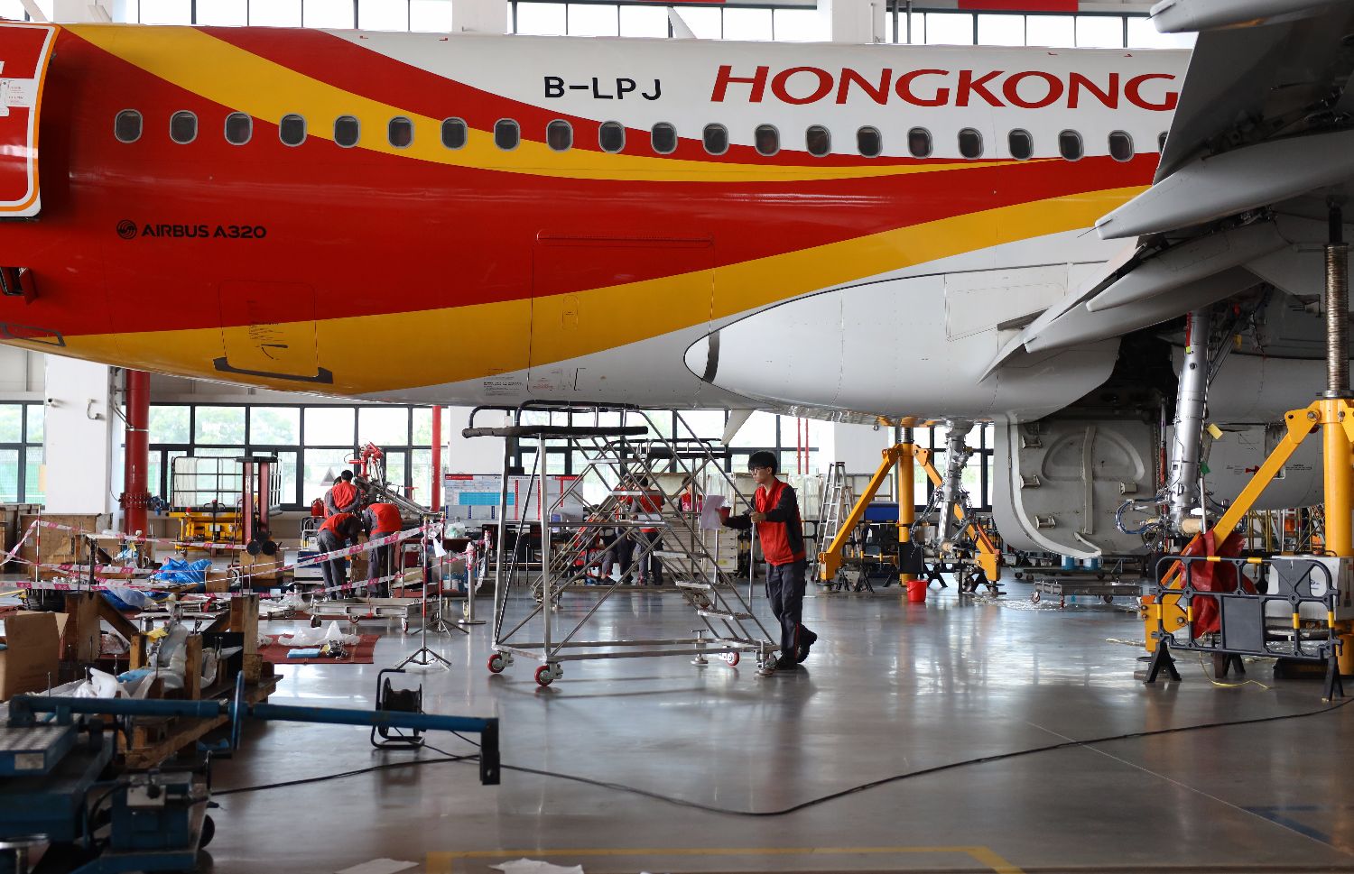 2023年3月20日,香港航空的一架空客A320飞机在中国海南自贸港一站式飞机维修产业基地进行检修。