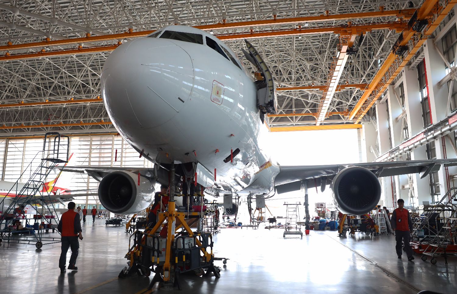 2023年3月20日,一架空客A320飞机在海南自贸港一站式飞机维修产业基地定检维修机库内接受检修。