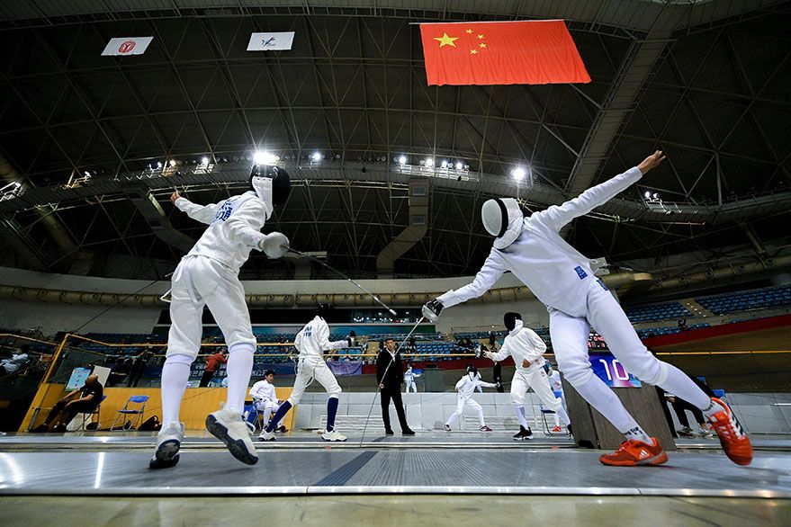 4月2日,选手在花剑比赛中。(图片来源:中新社)