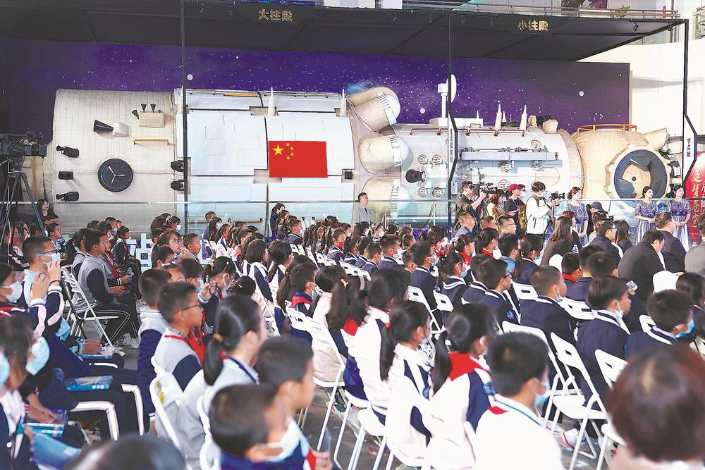 展览启动仪式上,中国人民解放军航天员大队第一任大队长申行运分享了航天员平时训练和执行任务的故事,并与两岸青少年代表进行现场互动,推动两岸青少年科技文化交流,启发两岸青少年的航天梦想。学生身旁就是天和核心舱1∶1模型。(图片来源:《厦门日报》)