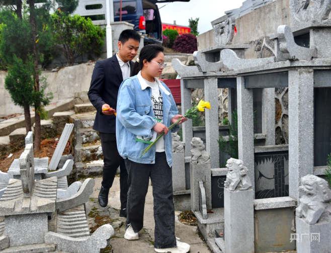 4月4日上午,湖南省邵阳市新邵县民政局在五泊山烈士陵园开展“文明祭祀平安清明”主题活动,引导群众树立新风,进一步推进移风易俗,营造安全有序、文明绿色的祭扫氛围。图为市民用鲜花祭扫。(图片来源:央广网)