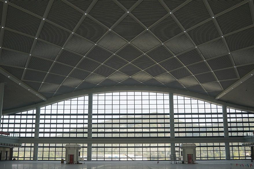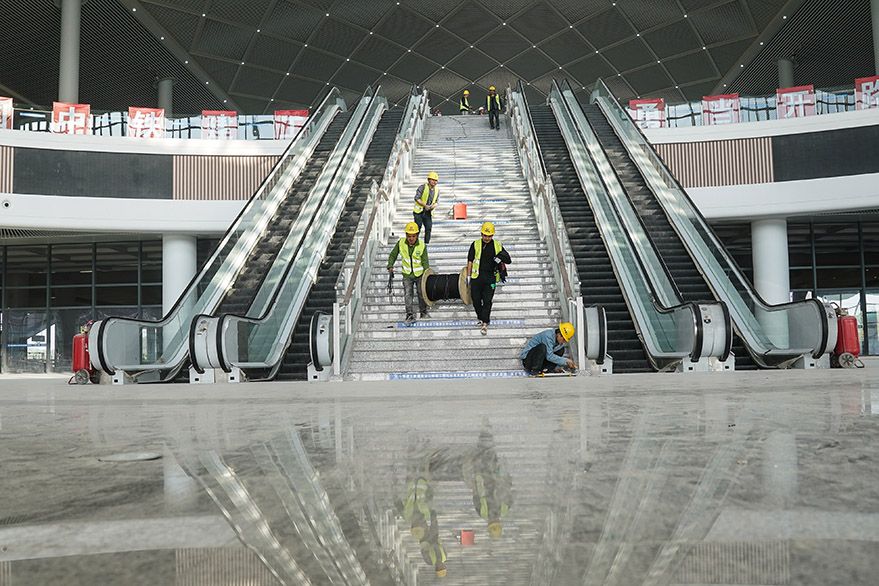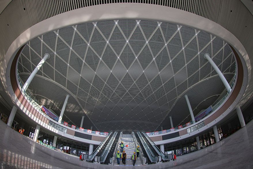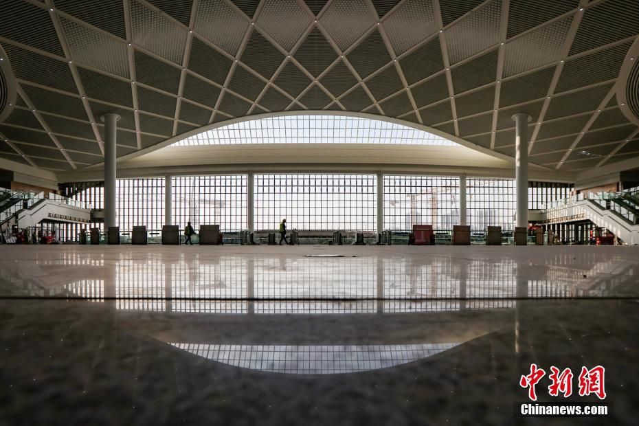 近日,由中铁建工集团承建的沪宁沿江高速铁路江阴站站房装饰装修作业进入收尾阶段。(图片来源:中新社)